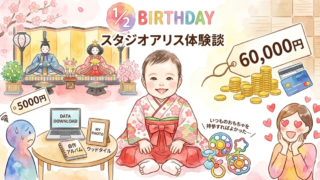 生後6ヶ月のハーフバースデー&ひな祭り撮影でスタジオアリスへ!予算5,500円のつもりが、可愛さに負けてまさかの総額6万円に!?当日のギャン泣きの様子や、安く済ませるために「データプラン+自作アルバム」を選んだ我が家のリアルな体験談です